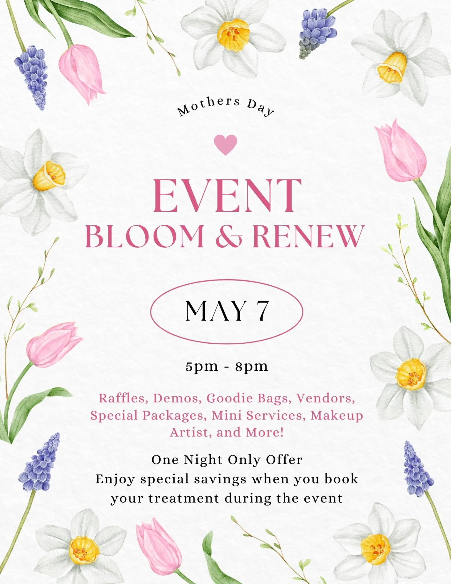 One Night Only Offer! Raffles, Demos, Goodie Bags, Vendors, Special Packages, Mini Services, Makeup Artist, and and exclusive event-only specials!